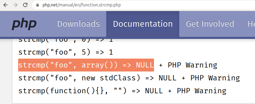 Khi đọc document về hàm strcmp của PHP, chúng ta dễ dàng thấy 1 số trường hợp khiến strcmp trả về null.