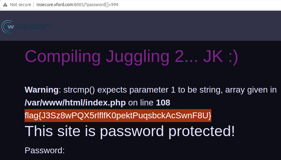Trong đó, khi so sánh một chuỗi với một mảng thì strcmp sẽ trả về null. Mà chúng ta có thể nhập vào 1 mảng bằng cách đổi ?password= thành ?password[]=