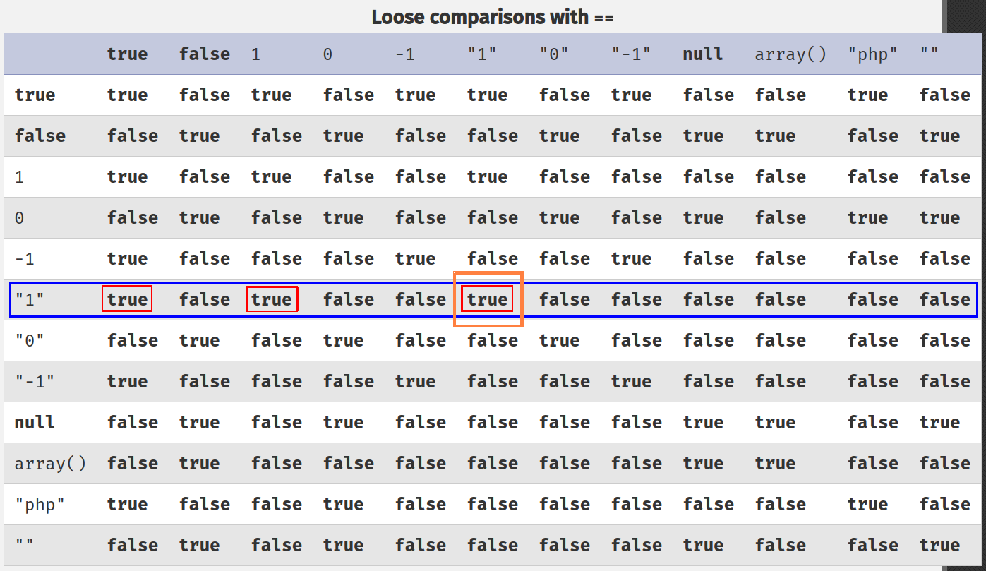 Việc so sánh string 1 cũng tương tự khi so sánh string 999 nên mình đã khoanh cả dòng đó lại bằng màu xanh. Các trường hợp có thể xảy ra TRUE là hướng chúng ta cần tìm để thỏa mãn được đoạn if thứ 2. Trong đó cần loại bỏ trường hợp được khoanh vàng luôn vì trường hợp này sẽ bị chặn tại đoạn if thứ nhất ("1" == "1" trả về TRUE và "1" === "1" cũng trả về TRUE).