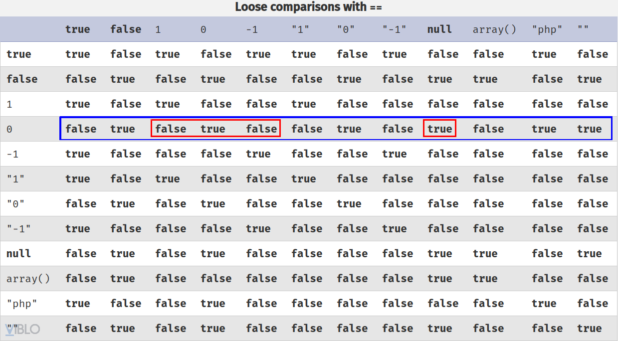Chú ý là: khi đọc giá trị từ GET request thì input của chúng ta chỉ là 1 string mà thôi, nên sẽ không thể truyền giá trị boolean được. Thế thì chỉ còn 1 phương án khả thi nhất, đó là so sánh 1 số với 1 string. Với phương án này thì xem cách PHP xử lý kiểu biến khi thực hiện so sánh ở bảng dưới đây sẽ rõ hơn.