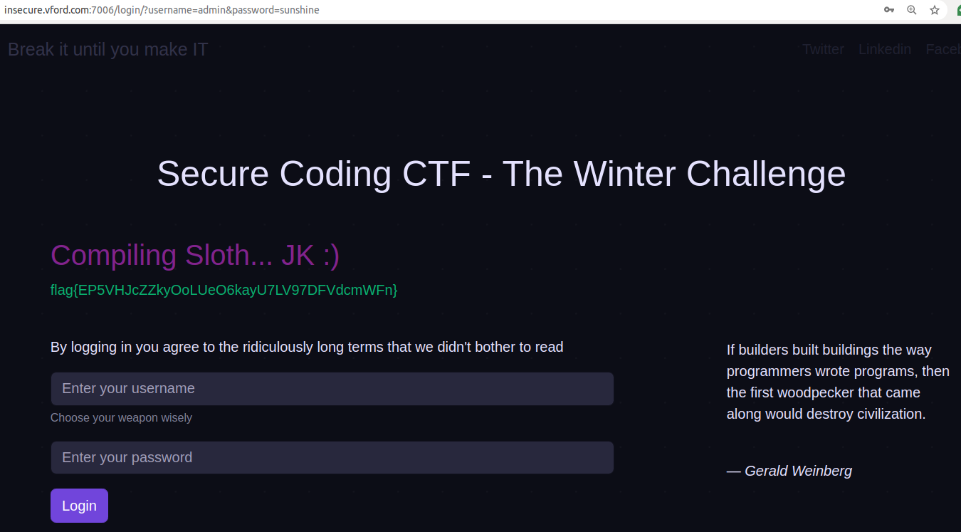 Với thông tin đăng nhập là admin/sunshine thì chúng ta có thể đăng nhập và lấy được flag