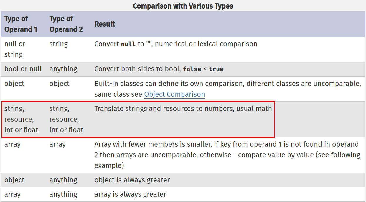 Để dễ tìm được input thỏa mãn thì chúng ta nên xem 3 bảng so sánh trong tài liệu về so sánh trong PHP