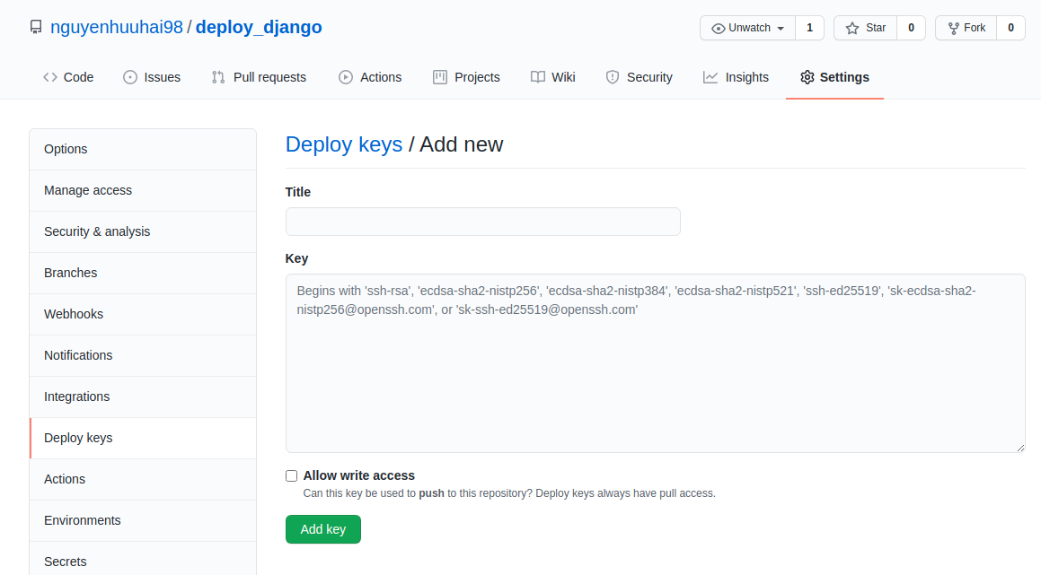 Lệnh trên sẽ in ra toàn bộ public key ra cửa sổ terminal, bạn chỉ cần copy nó lại. Tiếp theo truy cập vào repo trên GitHub và chọn mục Settings. Ở cột bên trái của tab Settings, chọn Deploy keys. Trong mục này, tiếp tục chọn Add deploy key và nhập lần lượt tên mà bạn muốn đặt cho key này và public key vừa copy ở bên server bỏ vào đây và chọn Add key để hoàn tất quá trình này