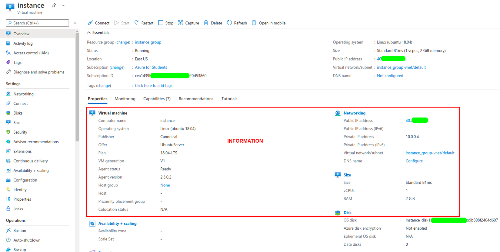 Thông tin của virtual machine nằm trong phần mình đã khoanh đỏ, các bạn chú ý đển Operating System chính là hệ điều hành mà chúng ta sử dụng cho VPS này. Và Public IP address chính là địa chỉ public để chúng ta truy cập trực tiếp từ browser.