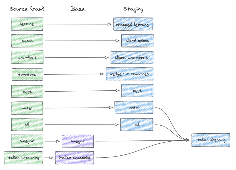 Tôi khá là chắc kèo chẳng có ai nhìn được tên bảng dữ liệu nào trong cái hình minh hoạ ở trên. Hình ảnh này được tôi lấy từ bài viết Data modeling techniques for more modularity, thứ mà đã giúp tôi hiểu dbt có thể khiến công việc của mình trở nên dễ dàng hơn hàng nghìn lần như thế nào.